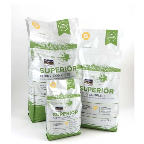 Karma Superior Puppy Complete zawiera więcej ryby, aby zapewnić wyższy poziom białek, które są głównym budulcem organizmu w okresie wzrostu. Najwyższej jakości mięso ryb w karmach Fish4Dogs jest pozbawione antybiotyków i hormonów dzięki czemu białko w karmie posiada wysoką przyswajalność i wartość biologiczną.