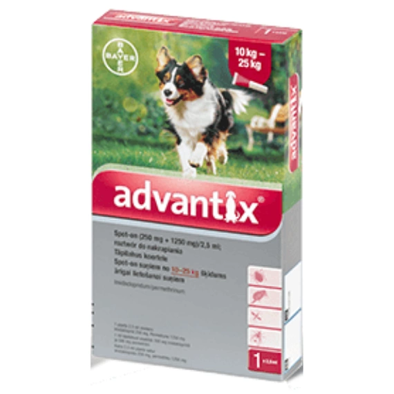 Advantix zapobiega i zwalcza infestację kleszczy (Ixodes ricinus, Rhipicephalus sanguineus, Dermacentor spp.) oraz pcheł (Ctenocephalides spp.) u psów. Działa odstraszająco na komary i muchówki (Phlebotomus sp.). Jednorazowe zastosowanie zapobiega dalszej inwazji kleszczy przez cztery tygodnie. Kleszcze są odstraszane oraz/lub zabijane, co ogranicza ryzyko wystąpienia chorób przez nie przenoszonych (np. boreliozy, riketsjozy, ehrlichiozy). Kleszcze znajdujące się na psie w momencie zastosowania preparatu zostaną zabite ale pomimo to pozostaną wczepione i będą widoczne.