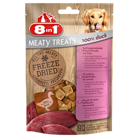 Dzięki procesowi liofilizacji, mięsne przysmaki 8in1 Freeze Dried zachowują pełną wartość odżywczą i charakteryzują się wspaniałym smakiem. Jest to idealne połączenie mięsa kaczki z pysznymi jabłkami. Doskonałe jako przekąska między posiłkami oraz nieodzowna nagroda dla Twojego pupila.