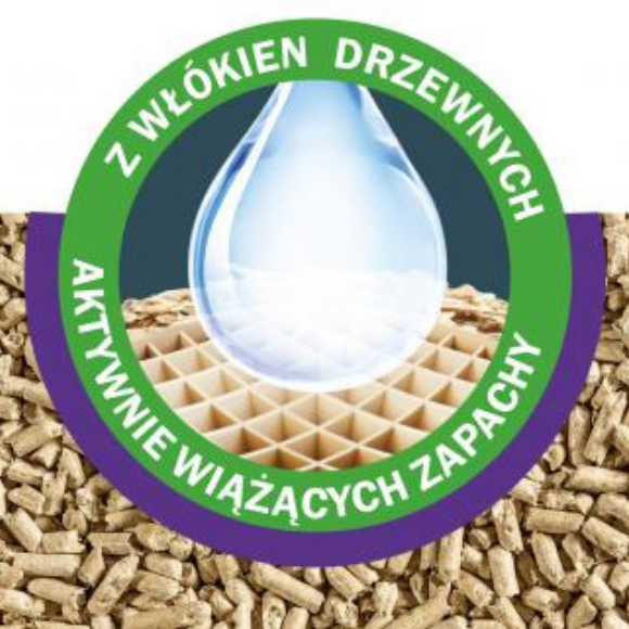 - Drewniany, zbrylający żwirek pelletowy do kuwet i toalet, wchłaniający i wiążący wilgoć oraz zapachy.