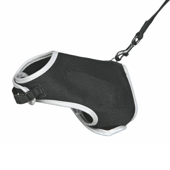 Szelki wykonane z nylonowej siatki, o regulowanym obwodzie. Dzięki podszyciu z miękkiego materiału, zwiększają komfort podczas używania. Wszyte elementy odblaskowe. Rozpinane, dzięki czemu zakładanie i zdejmowanie jest dość wygodne. Zapinane na plastikowy zatrzask.