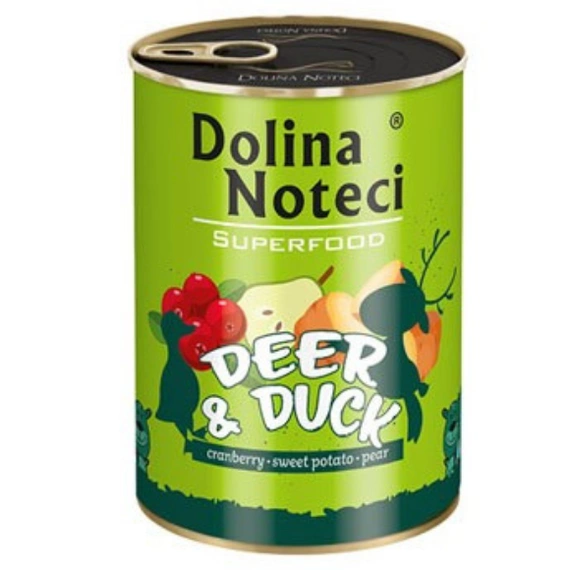 Bezzbożowa, mokra karma dla psów dorosłych wszystkich ras, przetworzona w minimalnym stopniu, aby zachować maksymalną ilość biologicznie aktywnych składników. Mięso i produkty pochodzenia zwierzęcego stanowią 80 % składu. W karmie Dolina Noteci Superfood Deer & Duck, znajduje się 40% mięsa kaczki i 40% mięsa jelenia.