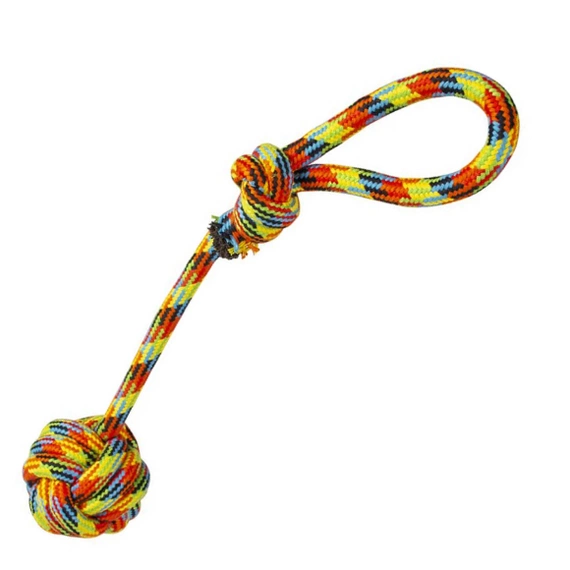 - Kolorowy, bawełniany sznur zapleciony w kształt piłki na linie z uchwytem, doskonały gryzak, aporter i zabawka interaktywna.