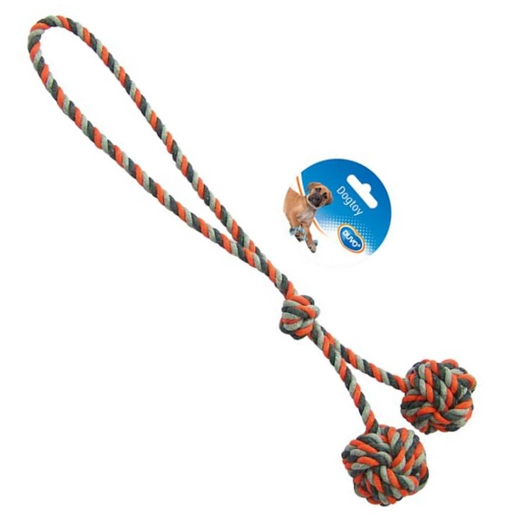 Zabawka wykonana z bawełnianej liny. Zaplecione w kształt piłki, które zawieszone są na linie zakończonej uchwytem. Dzięki takiej konstrukcji, zabawka pozwala na dalekie rzuty. Idealna do aktywnego spędzania czasu z psem. Przeciąganie, aportowanie, siłowanie się dostarczą niezapomnianych chwil bliskości człowieka z psem.