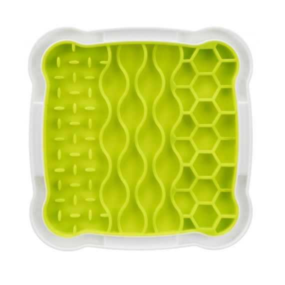 - może zostać użyta do podania mokrej karmy lub przysmaków w postaci pasty, bądź żelu - w takim przypadku osiągamy dwa efekty - pies będzie lizał znajdujące się na tacy jedzenie, poświęci więcej czasu na wylizywanie karmy z zakamarków i mniejszych przegródek - spowolnimy spożywanie posiłku u bardziej zachłannych psów, a dzięki lizaniu osiągniemy efekt uspokajający
