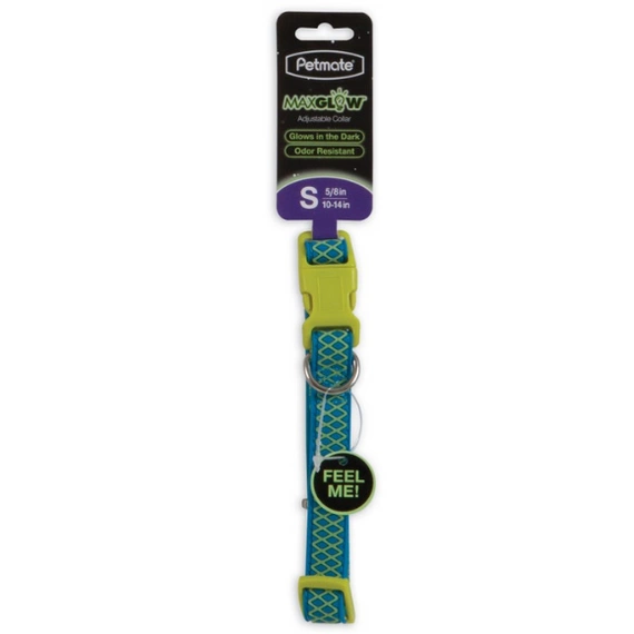 - Regulowana obroża wykonana z nylonu i świecącej w ciemności gumy.