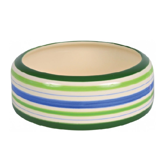 Miseczka zdobiona kolorowymi paskami (zielony - niebieski- kremowy) namalowanymi na zewnętrznych ściankach.