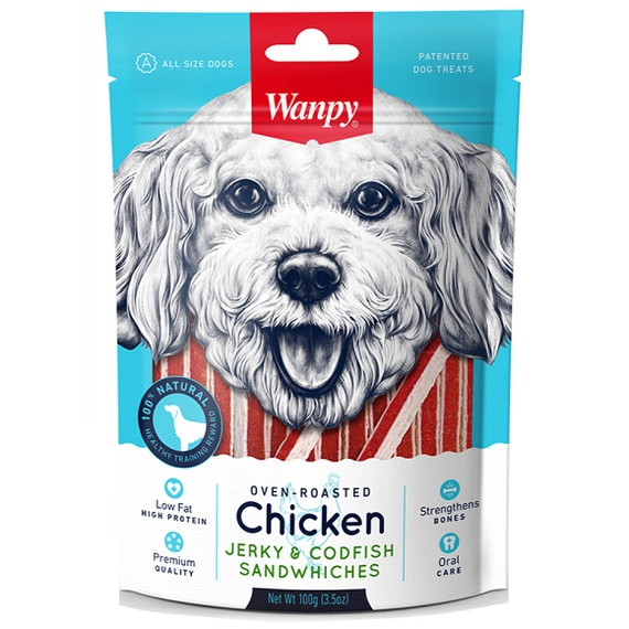 Wanpy Chicken & Codfish Sandwiches przysmak dla psa paseczki kurczaka z rybą 100g