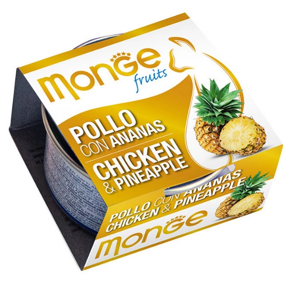 Karma Monge Fruit Chicken Ananas zaspokaja potrzeby żywieniowe dorosłych kotów. Charakteryzuje się wysoką wartością odżywczą, przy jednoczesnej niskiej zawartości tłuszczu.