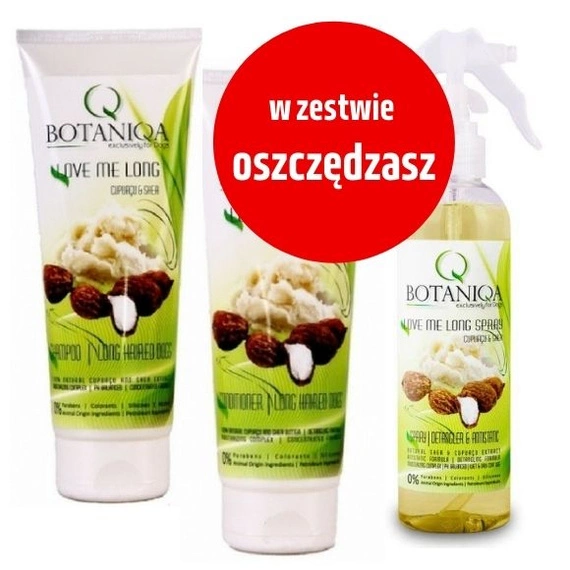 Zestaw trzech kosmetyków z linii Botaniqa Love Me Long przygotowanych z głównie z myślą o psach o długiej sierści, wymagającej delikatnej pielęgnacji. Ze względu na ich skład, kosmetyki mogą być stosowane dla wszystkich psów, niezależnie od rodzaju sierści. Należy jednak pamiętać, że w przypadku psów szorstkowłosych, przy regularnym używaniu może nastąpić zmiękczenie sierści.