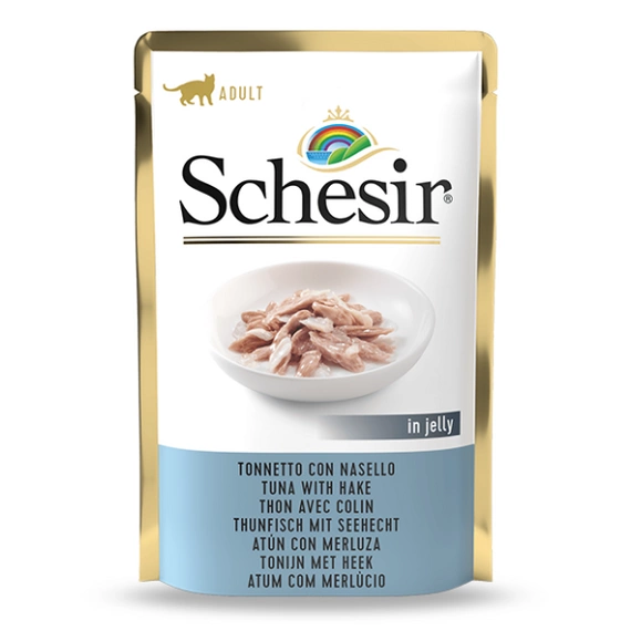 Tuńczyk i morsczuk w postaci filetów oraz dodatek ryżu, to doskonały wybór dla kotów preferujących morskie smaki. Filety z tuńczyka są głównym składnikiem karmy. Dodatek flietów z morszczuka - białe, delikatne i chude mięso - podnosi walory smakowe karmy. Karma Schesir tuńczyk z morszczukiem dostępna jest w postaci galaretki, która nadaje posiłkowi zwartą konsystencję.