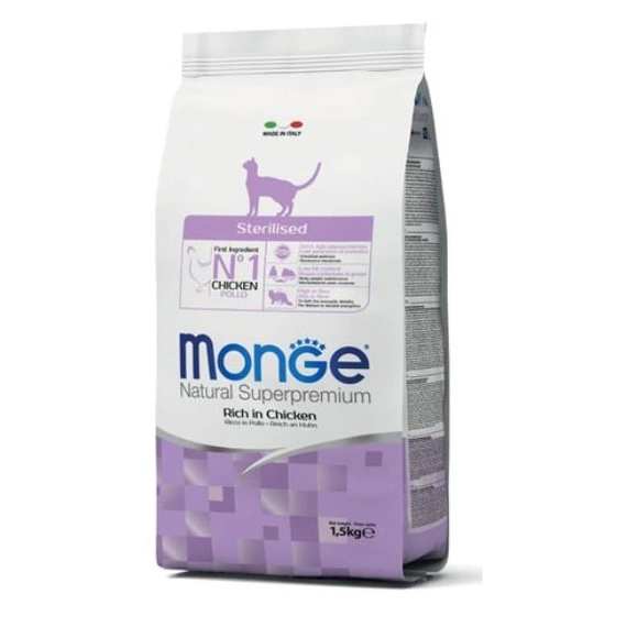 Sucha karma Monge Natural Superpremium Sterilised zawiera wszystkie niezbędne składniki odżywcze, jest bogata w białko zwierzęce, którego źródłem jest mięso kurczaka. W celu wsparcia naturalnej odporności organizmu karmę wzbogacono witaminą E, natomiast witaminy z grupy B pozwalają na optymalizację wykorzystania energii. Włókna roślinne i prebiotyki przyczyniają się do prawidłowego funkcjonowania przewodu pokarmowego.