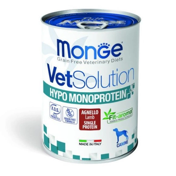 Karma Monge VetSolution Hypo Monoprotein została opracowana z myślą o wyeliminowaniu z diety psa nietolerowanych składników odżywczych. Jest to karma stworzona dla psów dorosłych. Starannie dobrane składniki minimalizują ryzyko wystąpienia alergii pokarmowej lub nietolerancji pokarmowej. Zawarte w karmie wyselekcjonowane białka przyczyniają się do eliminacji składników pokarmowych, które mogą inicjować powstawanie alergii lub nietolerancji pokarmowej. Produkty użyte do produkcji karmy Monge VetSolution Hypo Monoprotein, są najwyższej jakości, starannie wyselekcjonowane, tak, że nie powodują alergii pokarmowych. Jedynym źródłem białka zwierzęcego jest najwyższej jakości mięso jagnięce, a skrobia ziemniaczana jest jedynym źródłem węglowodanów. Karma Monge VetSolution Hypo Monoprotein, nie zawiera produktów mlecznych, glutenu, laktozy, które to składniki mogą prowadzić do powstawania nietolerancji pokarmowej.