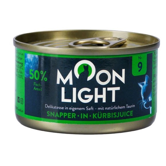 Moonlight Dinner to zdrowy, aromatyczny posiłek z soczystymi kawałkami lucjana, który zadowoli nawet najwybredniejsze kocie podniebienie. Każdy posiłek zawiera aż 50% mięsa z ryby. W 100% naturalne, pyszne danie: soczyste kawałki lucjana. Nie zawiera ziaren, polepszaczy smaku, soi, kukurydzy, produktów ubocznych pochodzenia zwierzęcego. 100% smakowitości, 100% naturalności.