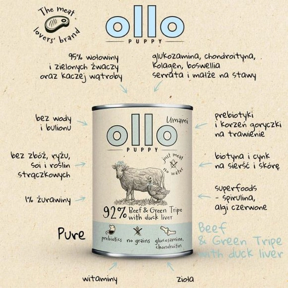 Ollo Umami Puppy Beef & Green Tripe with Duck Liver mokra karma dla szczeniąt - wołowina, żwacze, kacza wątróbka 400g