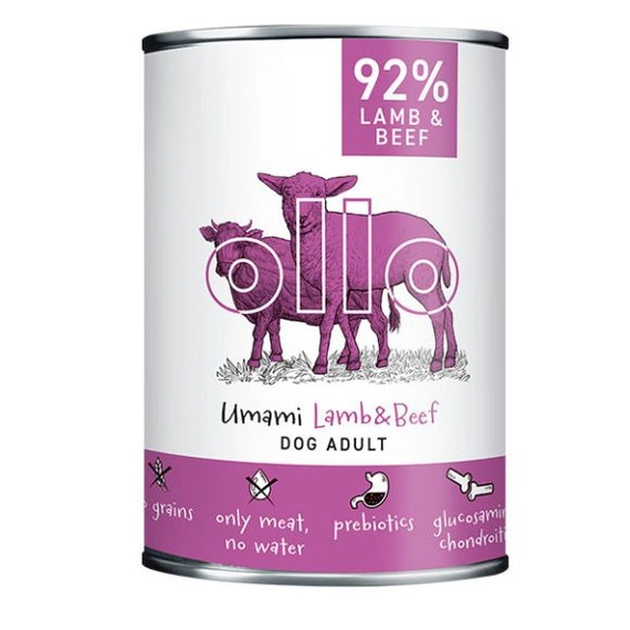 Mokra, pełnoporcjowa karma Ollo Umami Lamb & Beef oparta na mięsie jagnięcym i wołowinie. Jest optymalną dietą zapewniająca psom zdrowie i energię. Psy to zwierzęta mięsożerne, których układ pokarmowy jest ukształtowany tak, aby czerpać energię z mięsa innych zwierząt. Optymalna dieta każdego psa powinna być bogata w mięso, z niewielkim dodatkiem węglowodanów.