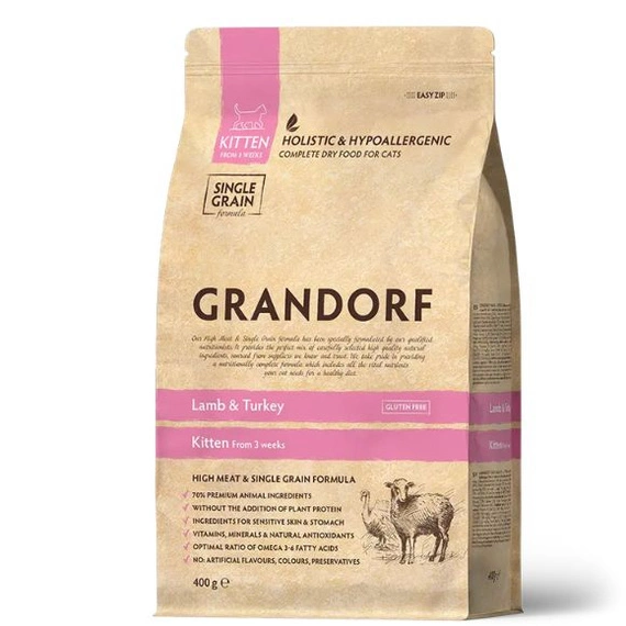Karma Grandorf Jagnięcina i Indyk Kitten została opracowana specjalnie dla kociąt od 3. tygodnia życia oraz kotek ciężarnych i karmiących. Jest to formuła holistyczna i hipoalergiczna, zawierająca 70% mięsa i składników pochodzenia zwierzęcego, co zapewnia wysokiej jakości białko niezbędne do prawidłowego wzrostu i rozwoju młodych kotów. Karma charakteryzuje się niską zawartością zbóż, co minimalizuje ryzyko nietolerancji pokarmowych i alergii. Dodatkowo, obecność składników wspierających stawy, takich jak glukozamina i chondroityna, sprzyja zdrowiu układu ruchu. Zawartość naturalnych przeciwutleniaczy wspomaga układ odpornościowy, a zrównoważony stosunek kwasów Omega 6 i Omega 3 pomaga w utrzymaniu zdrowej skóry i sierści.