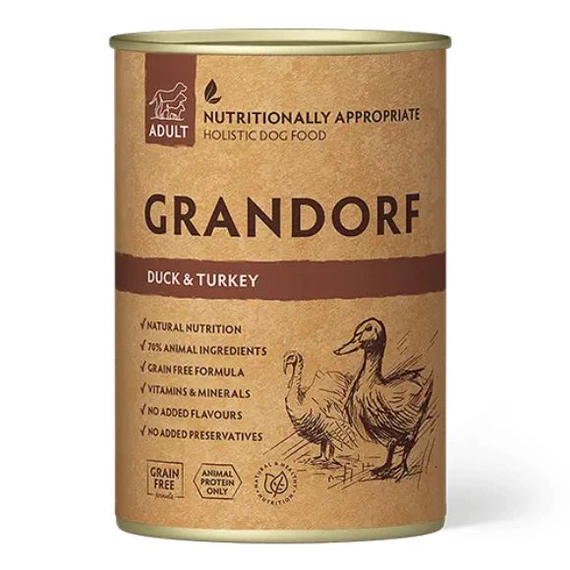 Grandorf mokra karma dla psów dorosłych Kaczka i Indyk puszka 400g