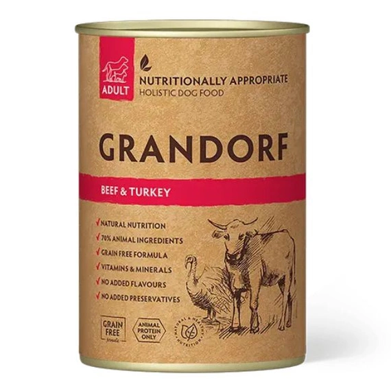 Grandorf mokra karma dla psów dorosłych Wołowina i Indyk puszka 400g