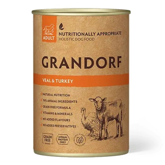 Grandorf Cielęcina i Indyk dla psów dorosłych to mokra karma, która doskonale odpowiada biologicznym potrzebom żywieniowym psów o normalnej aktywności, oferując im bogactwo mięsa i wartości odżywczych w czystej, bezzbożowej formule.