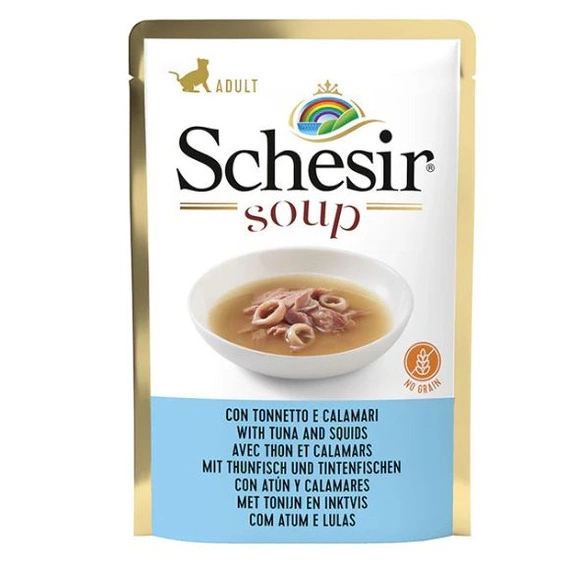 - Schesir mokra karma dla kota z tuńczykiem i kalmarami w bulionie. Naturalny skład, bez zbóż i konserwantów. Wspiera nawodnienie i zdrowie nerek. Idealna jako uzupełnienie diety lub dodatek do karmy suchej.