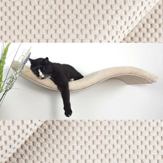 • Nowoczesna półka ścienna dla kota o kształcie fali – idealna do wspinaczki, odpoczynku i obserwacji. Stabilna konstrukcja, kremowy kolor, długość 75 cm.