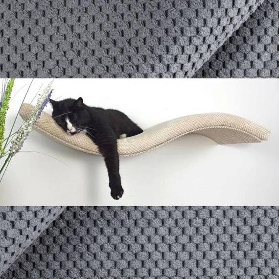 • Nowoczesna półka ścienna dla kota o kształcie fali – idealna do wspinaczki, odpoczynku i obserwacji. Stabilna konstrukcja, ciemnoszary kolor, długość 75 cm.
