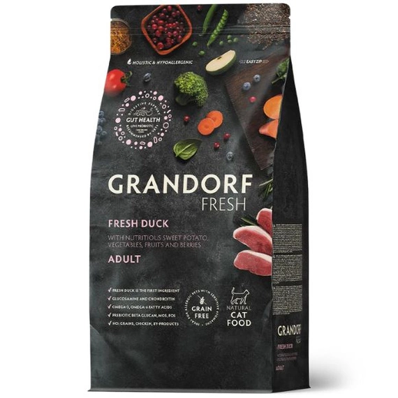 Grandorf Fresh Adult Duck to pełnoporcjowa, bezzbożowa i bezglutenowa sucha karma, stworzona z myślą o dorosłych kotach, także wrażliwych oraz z alergiami pokarmowymi. Jej głównym składnikiem jest świeże mięso z kaczki – lekkostrawne, niskotłuszczowe, aromatyczne i bogate w cenne aminokwasy.