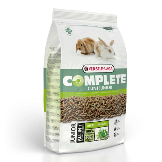 Kompletna, lekkostrawna ekstrudowana karma Versele-Laga Complete Cuni Junior jest przeznaczona do karmienia młodych królików w wieku do 8 miesięcy. W karmie znajdują się niezmielone, długie włókna o dużej zawartości krzemianów, co wymaga dłuższego żucia, niezbędnego do ścierania zębów. Ma to szczególne znaczenie dla królików miniaturowych. Zawartość tych długich włókien oraz dodatek prebiotyków, frukto-oligosacharydów (FOS) i mannan-oligosacharydów (MOS) korzystnie wpływa na mikroflorę jelitową, a co za tym idzie na prawidłowe funkcjonowanie układu pokarmowego. Karma charakteryzuje się niską zawartością skrobi.