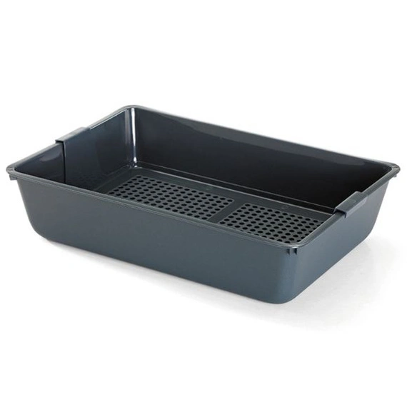 Odkryta kuweta dla kota, wyposażona we wkład z dużymi otworami umożliwiającymi oddzielenie czystego żwirku od nieczystości.